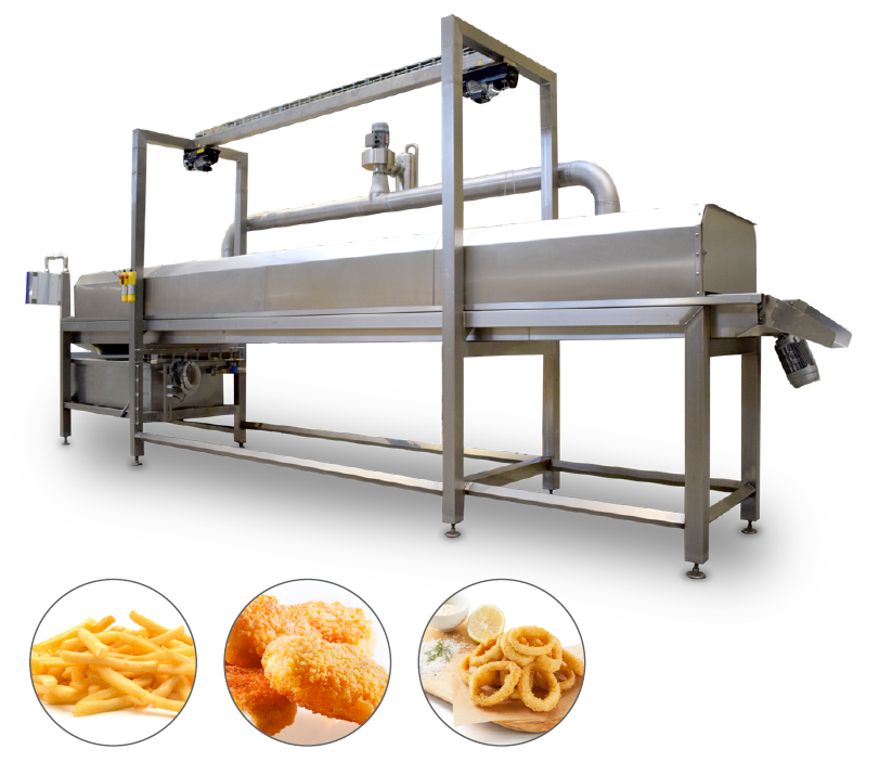 Táto kontinuálna fritéza je najnovším fenoménom v oblasti potravinárskych technológií. Konštrukcia tejto kontinuálnej fritézy, ktorú navrhli odborníci s najnovšími znalosťami v produkcii kontinuálnych fritéz, zaručuje vynikajúcu účinnosť a šetrnosť k životnému prostrediu.