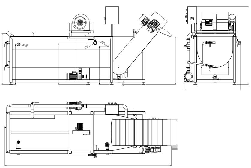 Bublinková umývačka Normit Wash W je vybavená dvomi okruhmi: cirkuláciou vody a distribúciou vzduchu. Systém cirkulácie vody zabezpečuje pohyb produktu pozdĺž umývacej vane, systém generovania a distribúcie vzduchu vytvára rovnomernú bublinkovú kúpeľ po celej dĺžke umývacej vane. Nečistoty sa usádzajú na dno vane pod vzduchové trysky a vzduch ich už ďalej nevíri (zóna na separáciu kameňa).
